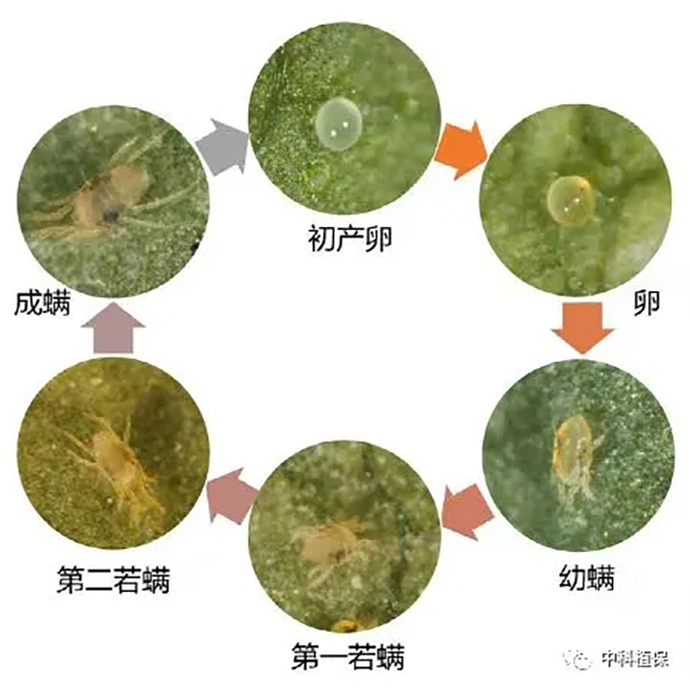 若螨:體橢圓形,淡橙黃色或深綠色,眼紅色,足4對,體背兩側各有一個深綠色或暗紅色圓形斑,后期與成螨相似。