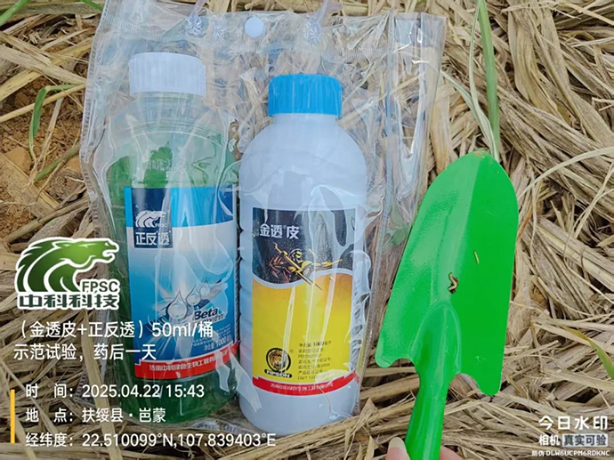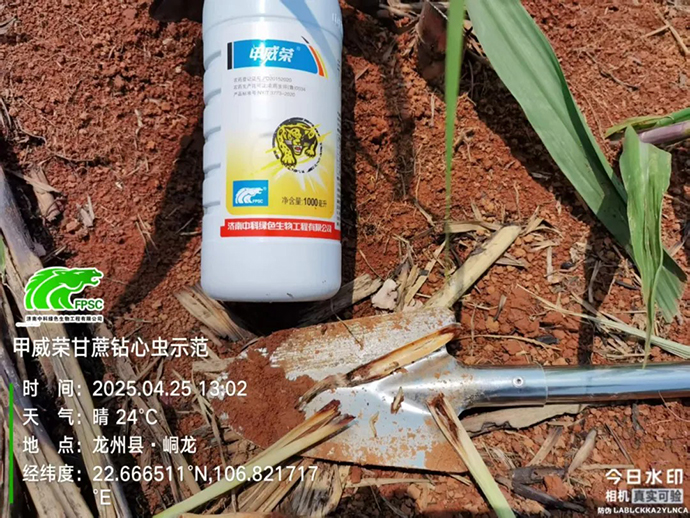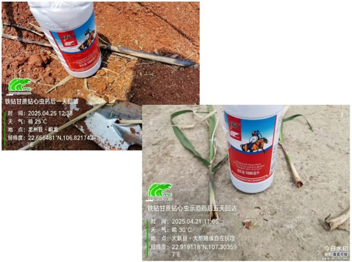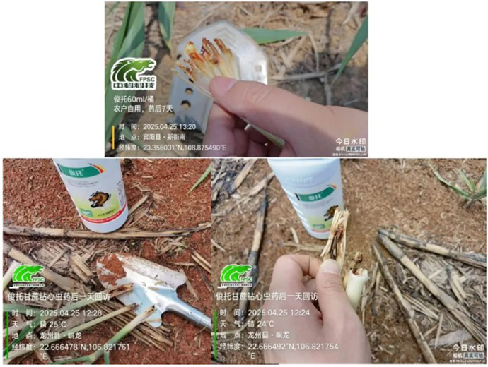 中科金透皮(3.2%阿維菌素)50ml/桶水單打或者配合中科正反透(4.5%高效氯氰菊酯)等藥劑一起使用,可以有效防治甘蔗鉆心蟲,并且兼防薊馬。