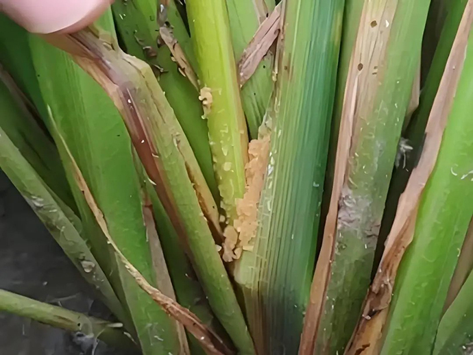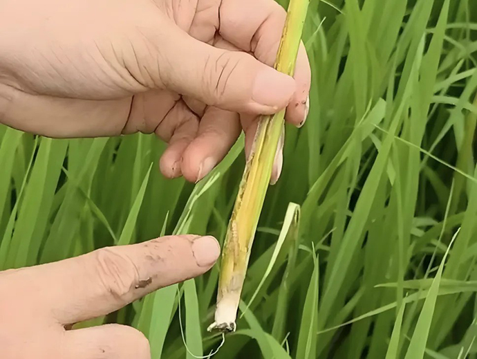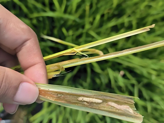鉆心蟲稱為“水稻的癌癥”,幼蟲蛀食稻莖,破壞輸導組織,導致養分斷供。危害癥狀分三個階段: